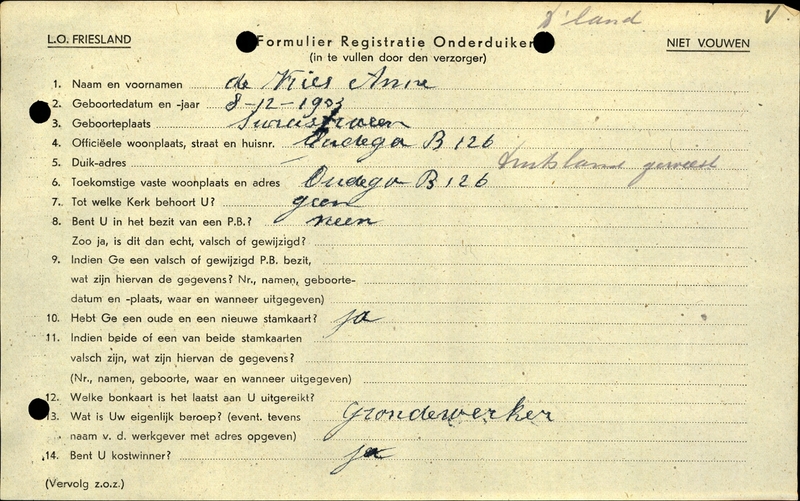 Onderduikinschrijving van Anne de Vries