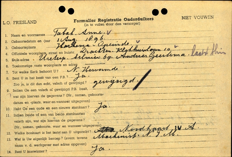 Duikadres: Selmien 69, Ureterp - Oorspronkelijk adres: Klokhuislaan 10, Drachten - Reden onderduik: staking