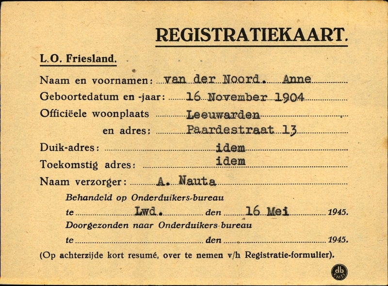 Onderduikregistratie van Anne van der Noord
