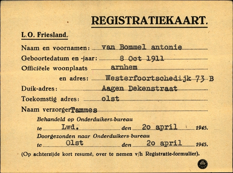 Duikadres: Aagje Dekenstraat, Leeuwarden - Oorspronkelijk adres: Westervoortsedijk 73 B, Arnhem - Reden onderduik: arbeidsinzet - Overige opmerkingen: Achterkant beroep: Bedrijfsleider - Achterkant naam werkgever: -
