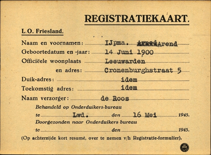 Duikadres: Van Cronenburchstraat 5, Leeuwarden - Oorspronkelijk adres: Van Cronenburchstraat 5, Leeuwarden - Reden onderduik: arbeidsinzet - Overige opmerkingen: Achterkant bijzonderheden: PB in beslag genomen door SD. - Goede stkrt. - Achterkant beroep: Handelaar in stofzuigers - Achterkant naam werkgever: -
