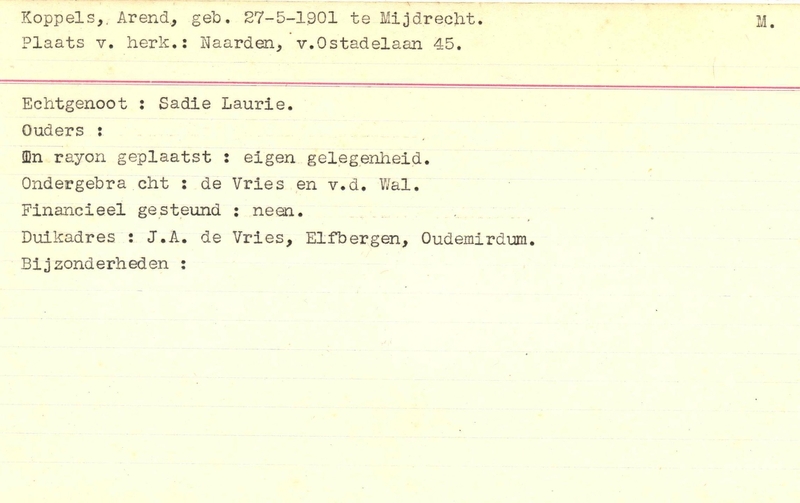 Onderduikinschrijving van Arend Koppels