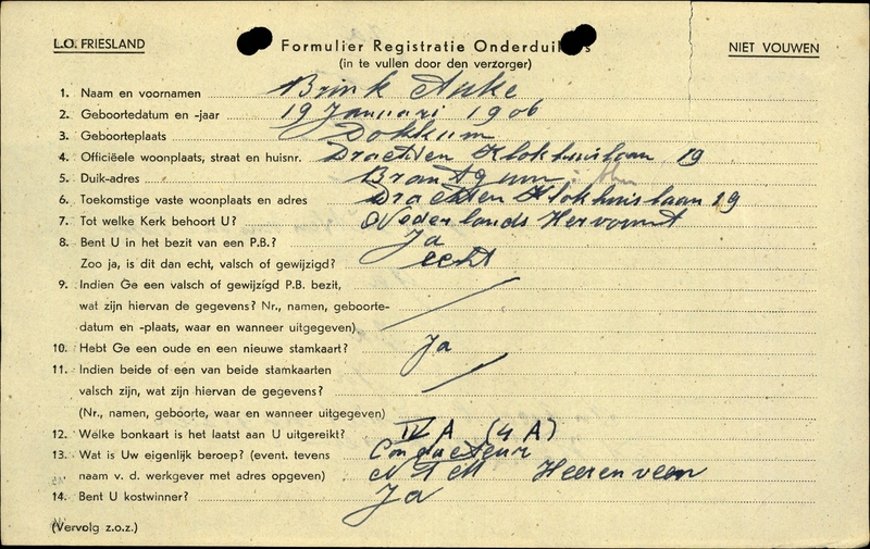 Duikadres: Brantgum - Oorspronkelijk adres: Klokhuislaan 19, Drachten - Reden onderduik: staking - Overige opmerkingen: Bijzondere opmerkingen: Inboedel nog niet nagezien net aangekomen.