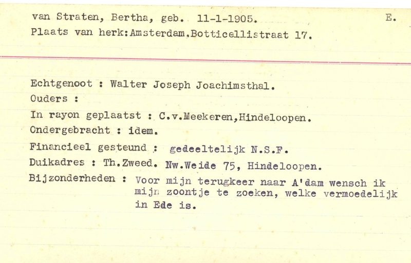 Duikadres: Nieuwe Weide 75, Hindeloopen - Oorspronkelijk adres: Botticellistraat 17, Amsterdam - Overige opmerkingen: Bijzonderheden: Financieel gesteund: gedeeltelijk N.S.F. - Voor mijn terugkeer naar A'dam wensch ik mijn zoontje te zoeken, welke vermoedelijk in Ede is.