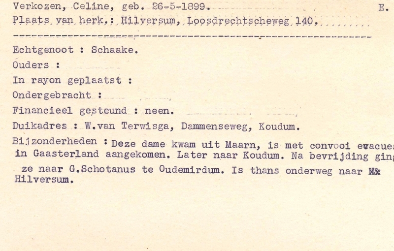 Duikadres: Dammenseweg, Koudum - Oorspronkelijk adres: Loosdrechtseweg 140, Hilversum - Overige opmerkingen: Bijzonderheden: "deze dame kwam uit Maarn, is met convooi evacuees in Gaasterland aangekomen. Later naar Koudum. Na bevrijding ging ze naar G. Schotanus te Oudemirdum. Is thans onderweg naar Hilversum.
