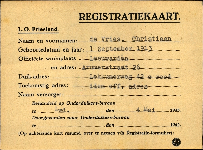 Duikadres: Lekkumerweg 42 c rood, Leeuwarden - Oorspronkelijk adres: Arumerstraat 26, Leeuwarden - Reden onderduik: anderszins - Overige opmerkingen: Achterkant bijzonderheden: Ondergedoken wegens arrestatie en daarna bevrijding uit de gevangenis - Achterkant beroep: Boekhouder