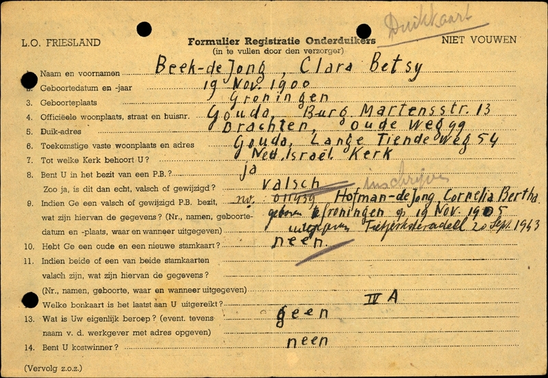 Duikadres: Oudeweg 99, Drachten - Oorspronkelijk adres: Burgemeester Martensstraat 13, Gouda - Reden onderduik: jodenvervolging - Overige opmerkingen: Bijzondere opmerkingen: Vals P.B.: no. 011439 Hofman-de Jong, Cornelia Bertha geboren te Groningen op 19 Nov. 1905. Uitgegeven Tietjerksteradeel 20 Sept. 1943. - - Echtgenoot: Dr. A. Beek