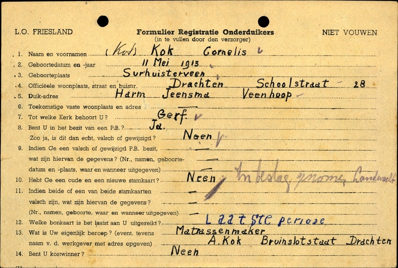 Onderduikinschrijving van Cornelis Kok