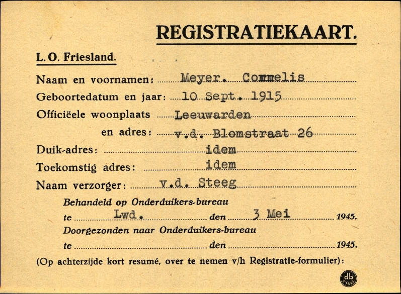 Duikadres: Van Blomstraat 26, Leeuwarden - Oorspronkelijk adres: Van Blomstraat 26, Leeuwarden - Reden onderduik: arbeidsinzet - Overige opmerkingen: Achterkant beroep: Chauffeur