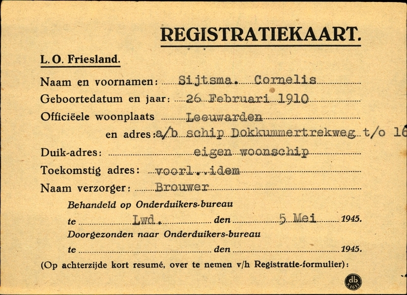 Duikadres: Eigen woonschip, - Oorspronkelijk adres: Aan boord schip Dokkumertrekweg t/o 16, Leeuwarden - Reden onderduik: arbeidsinzet - Overige opmerkingen: Achterkant beroep: koopman in gallanterieën