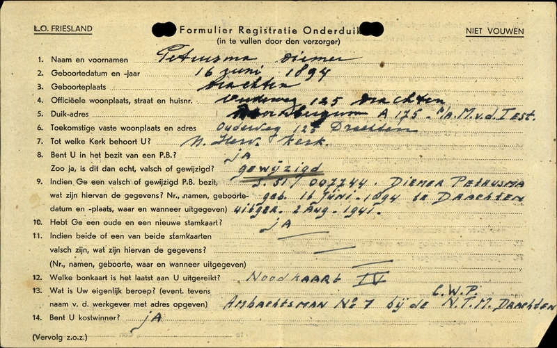 Onderduikinschrijving van Diemer Petrusma