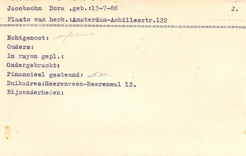 Duikadres: Herenwal 12, Heerenveen - Oorspronkelijk adres: Achillesstraat 122, Amsterdam - Overige opmerkingen: Bijzonderheden: ongehuwd