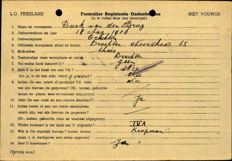 Onderduikinschrijving van Durk van den Brug