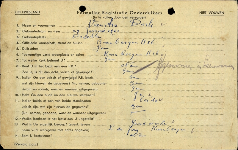 Onderduikinschrijving van Durk Veenstra