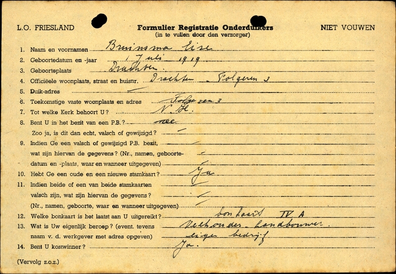 - Oorspronkelijk adres: Folgeren 3, Drachten - Reden onderduik: arbeidsinzet - Overige opmerkingen: Bijzondere opmerkingen: Duikadres: geen vermelding.