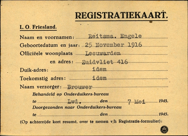 Duikadres: Zuidvliet 416, Leeuwarden - Oorspronkelijk adres: Zuidvliet 416, Leeuwarden - Reden onderduik: arbeidsinzet - Overige opmerkingen: Achterkant bijzonderheden: Alleen nieuwe stkrt. - Achterkant beroep: Los werkman - Achterkant naam werkgever: -