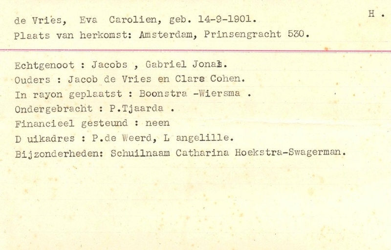 Onderduikinschrijving van Eva Carolien de Vries