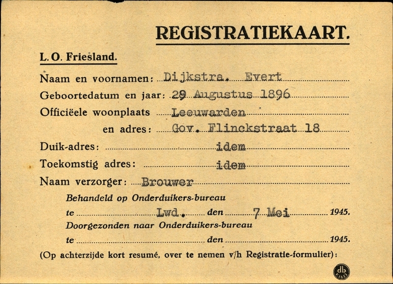 Duikadres: Govert Flinckstraat 18, Leeuwarden - Oorspronkelijk adres: Govert Flinckstraat 18, Leeuwarden - Reden onderduik: staking - Overige opmerkingen: Achterkant beroep: commies - Achterkant naam werkgever: Nederl. Tramweg Maaty
