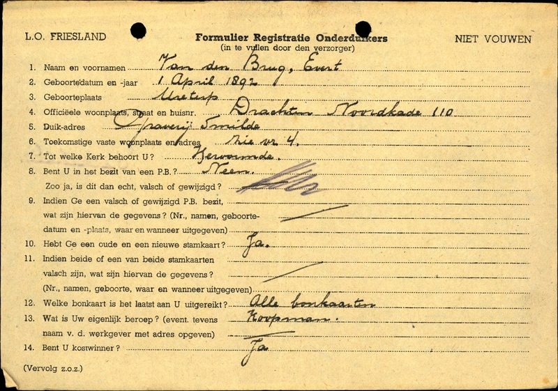 Duikadres: Graverij, Smilde - Oorspronkelijk adres: Noordkade 110, Drachten - Reden onderduik: anderszins - Overige opmerkingen: Bijzondere opmerkingen: Reden onderduik later toegevoegd: Smilde - salaris bij het graven in Smilde. - f5,= per dag. - Kreeg steun van Maatschappelijk Hulpbetoon.