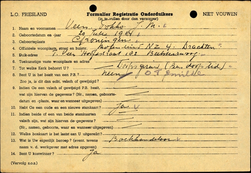 Duikadres: Hoofdstraat 182, Beetsterzwaag - Oorspronkelijk adres: Moleneind Noordzijde 4, Drachten - Reden onderduik: arbeidsinzet - Overige opmerkingen: Bijzondere opmerkingen: O.T. Smilde