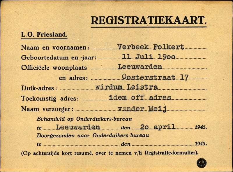 Duikadres: Wirdum - Oorspronkelijk adres: Oosterstraat 17, Leeuwarden - Reden onderduik: staking - Overige opmerkingen: Achterkant bijzonderheden: Vermelding bij duik-adres: 'Leistra' - Achterkant beroep: machinist - Achterkant naam werkgever: NS