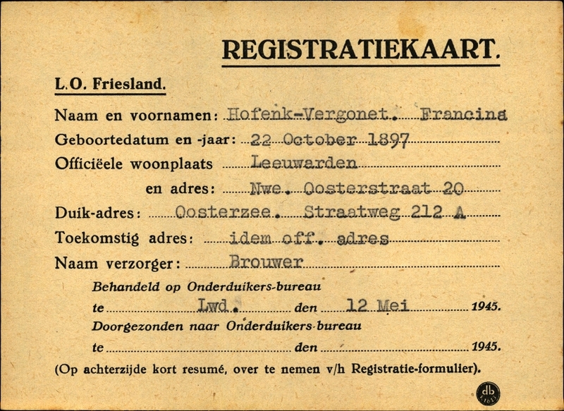 Onderduikinschrijving van Francina Hofenk-Vergonet