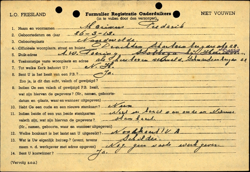 Onderduikinschrijving van Frederik Marinus