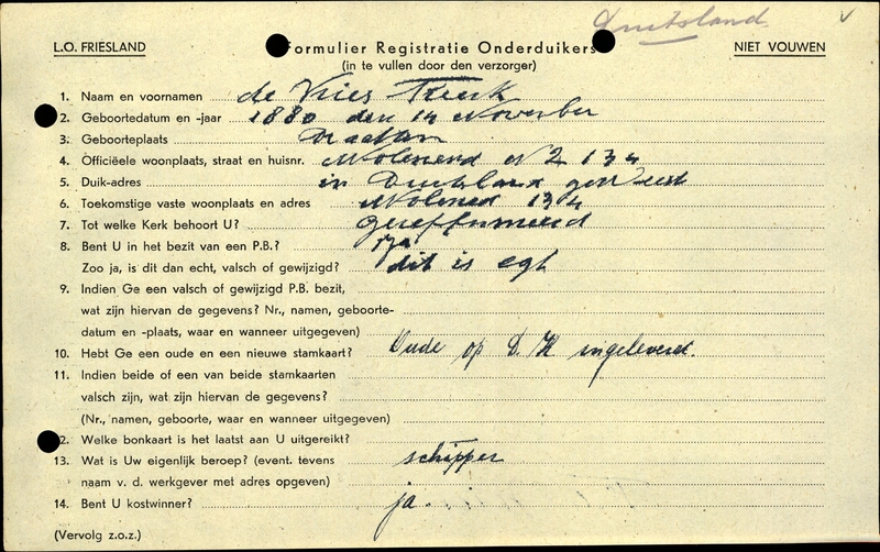 Onderduikinschrijving van Freerk de Vries