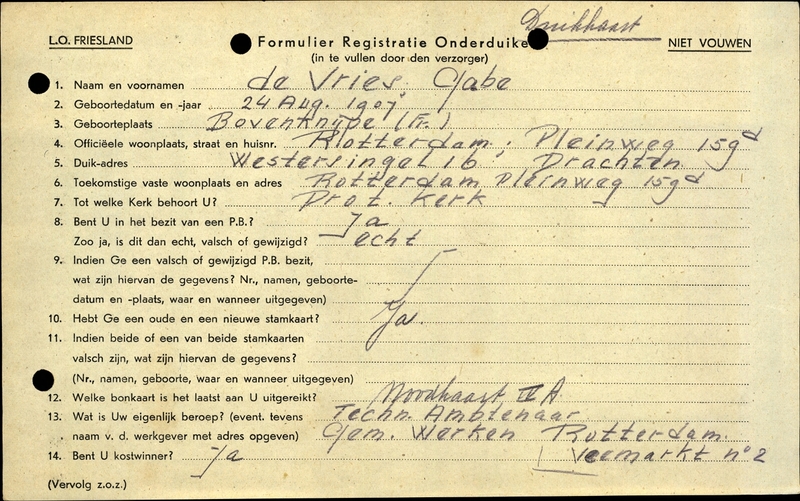 Duikadres: Westersingel 16, Drachten - Oorspronkelijk adres: Pleinweg 159d, Rotterdam - Reden onderduik: arbeidsinzet