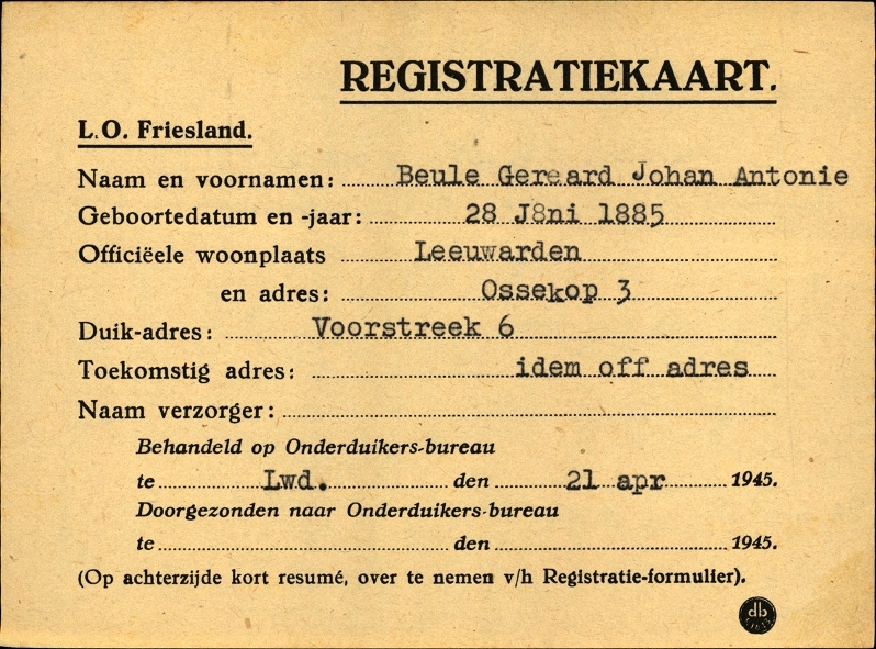 Onderduikinschrijving van Gereard Johan Antonie Beule