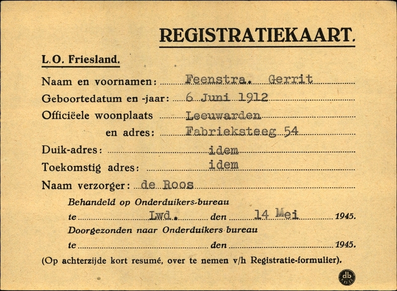 Duikadres: Fabrieksteeg 54, Leeuwarden - Oorspronkelijk adres: Fabrieksteeg 54, Leeuwarden - Reden onderduik: krijgsgevangene - Overige opmerkingen: Achterkant bijzonderheden: Ondergedoken wegens kr.gev.schap en A.I. - Achterkant beroep: varensgezel