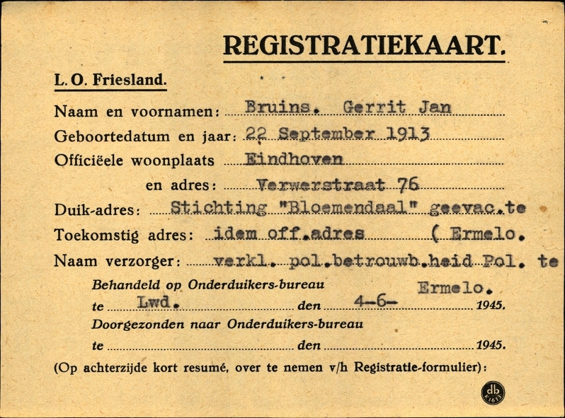 Onderduikinschrijving van Gerrit Jan Bruins