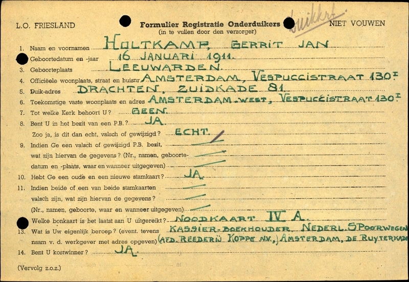 Duikadres: Zuidkade 81, Drachten - Oorspronkelijk adres: Vespuccistraat 130 I, Amsterdam - Reden onderduik: staking - Overige opmerkingen: Bijzondere opmerkingen: Gehele gezin is in Drachten toestand in Amsterdam daarom onbekend.