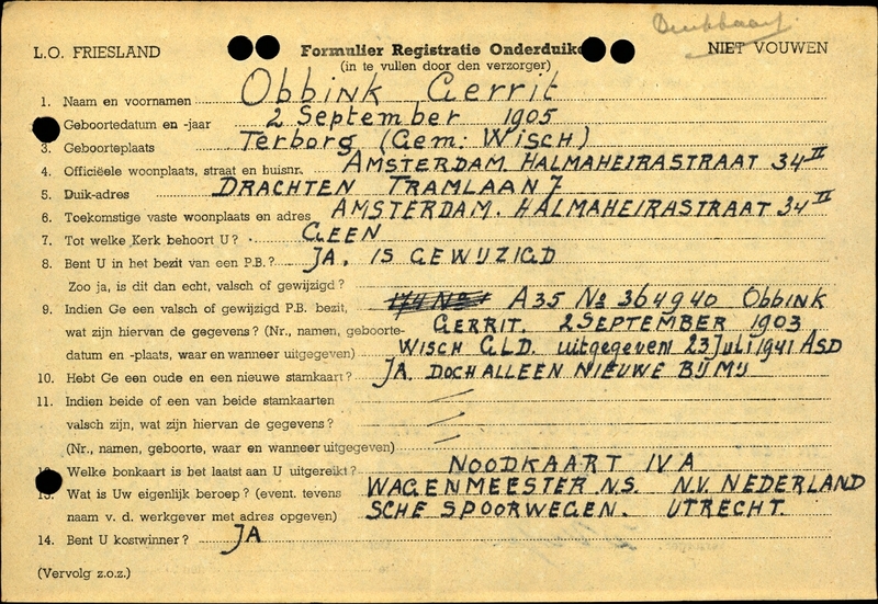 Duikadres: Tramlaan 7, Drachten - Oorspronkelijk adres: Halmaheirastraat 34 II, Amsterdam - Reden onderduik: anderszins - Overige opmerkingen: Bijzondere opmerkingen: Ondergedoken op last van Nederlandse regering Londen. - - Ik heb de laatste 4 weken geen geld ontvangen en weet ook niet of mijn vrouw dit heeft ontvangen. Daar ik sindsdien geen bericht meer heb gehad. En ook geen kostgeld heb kunnen betalen.