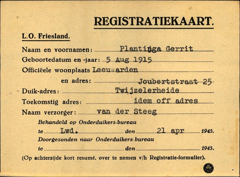 Duikadres: Twijzelerheide - Oorspronkelijk adres: Joubertstraat 25, Leeuwarden - Reden onderduik: anderszins - Overige opmerkingen: Achterkant bijzonderheden: Toekomstig adres: idem off adres - - Behandeld op onderduikers-bureau te Lwd. den 21 apr 1945. - ondergedoken vanwege O T - Achterkant beroep: fabriekarbeider - Achterkant naam werkgever: Fa Benninga