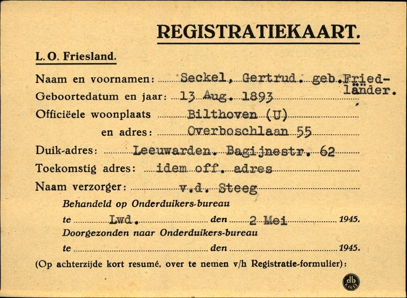 Duikadres: Bagijnestraat 62, Leeuwarden - Oorspronkelijk adres: Overboslaan 55, Bilthoven - Reden onderduik: jodenvervolging - Overige opmerkingen: Achterkant bijzonderheden: Gehuwd met Seckel. - Geen stkrt. Behandeld op Onderduikers-bureau te Lwd. op 2 mei 1945. - Achterkant beroep: Onbekend - Achterkant naam werkgever: -