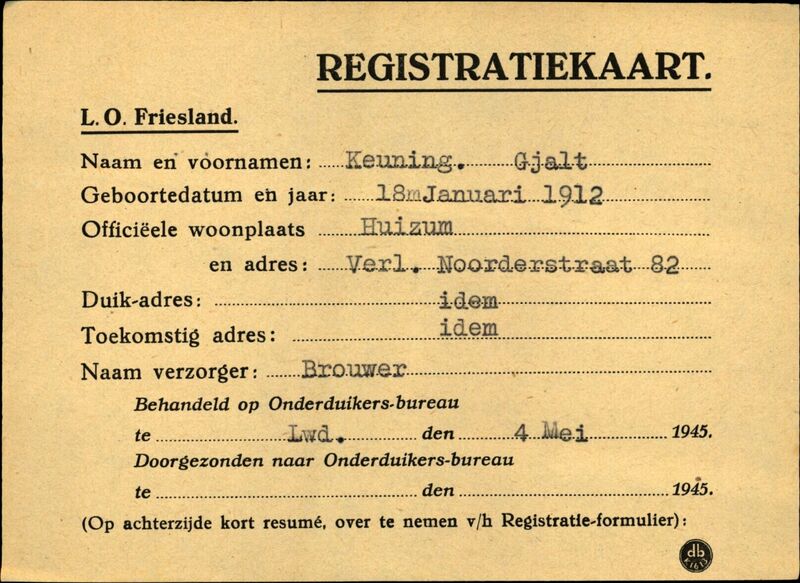 Duikadres: Verlengde Noorderstraat 82, Huizum - Oorspronkelijk adres: Verlengde Noorderstraat 82, Huizum - Reden onderduik: arbeidsinzet - Overige opmerkingen: Achterkant bijzonderheden: gewijzigd PB. goede stkrt. - Achterkant beroep: Reiziger