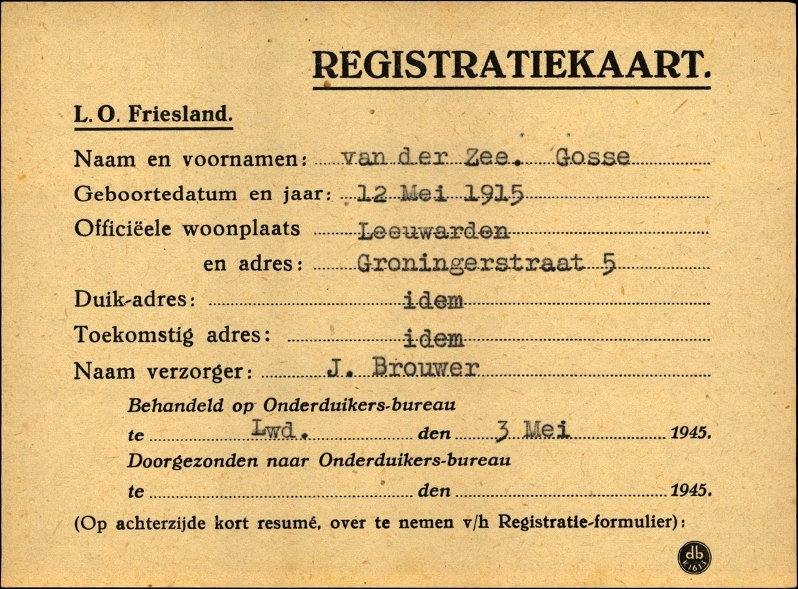 Duikadres: Groningerstraat 5, Leeuwarden - Oorspronkelijk adres: Groningerstraat 5, Leeuwarden - Reden onderduik: anderszins - Overige opmerkingen: Achterkant bijzonderheden: Reden onderduiken onbekend. - Achterkant beroep: Magazijnbediende - Achterkant naam werkgever: -