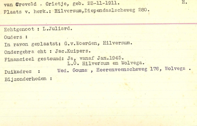 Duikadres: Heerenveenseweg 176, Wolvega - Oorspronkelijk adres: Diependaalselaan 280, Hilversum - Overige opmerkingen: Bijzonderheden: Financieel gesteund: Ja, vanaf Jan. 1945. L.O. Hilversum en Wolvega