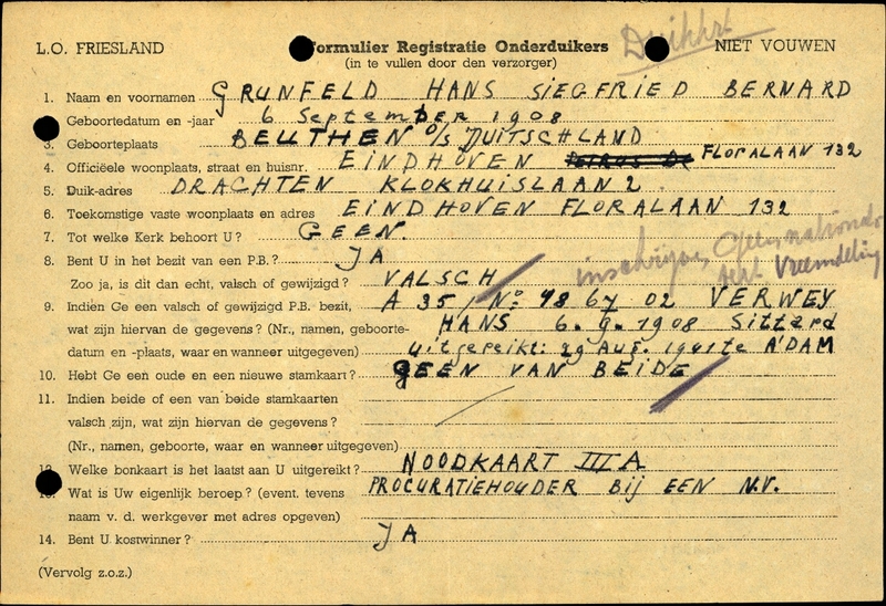 Onderduikinschrijving van Hans Siegfried Bernard Grunfeld