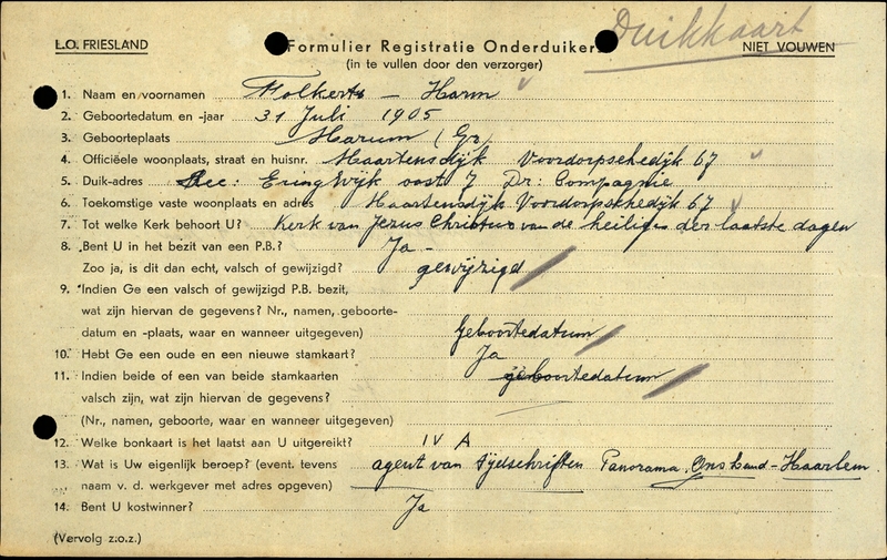 Duikadres: Siktaris Eringawyk Oost 7, Drachtstercompagnie - Oorspronkelijk adres: Voordorpsedijk 67, Maartensdijk - Reden onderduik: arbeidsinzet - Overige opmerkingen: Bijzondere opmerkingen: Behoort tot kerk van Jezus Christus van de heiligen der laatste dagen.