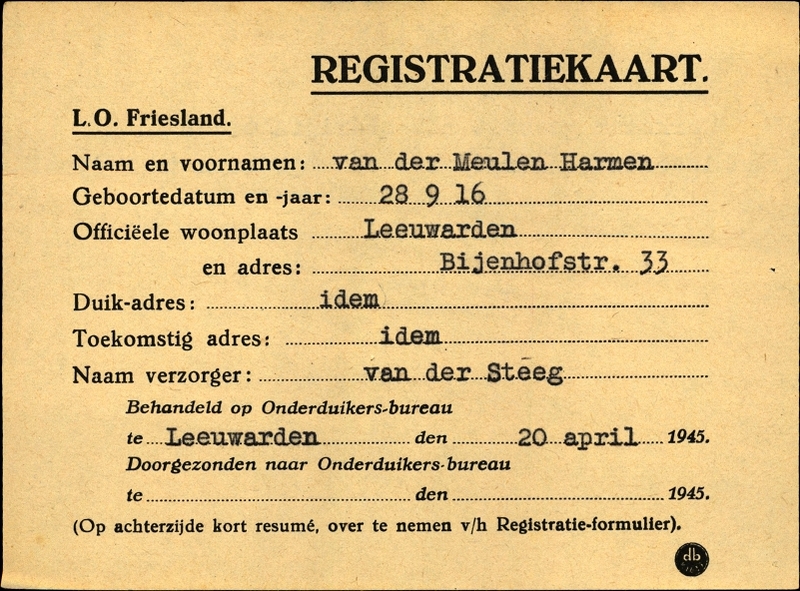 Duikadres: Bijenhofstraat 33, Leeuwarden - Oorspronkelijk adres: Bijenhofstraat 33, Leeuwarden - Reden onderduik: anderszins - Overige opmerkingen: Achterkant bijzonderheden: "Ondergedoken vanwege werk in Fries - Achterkant beroep: Bedrijfsleider machinebouw