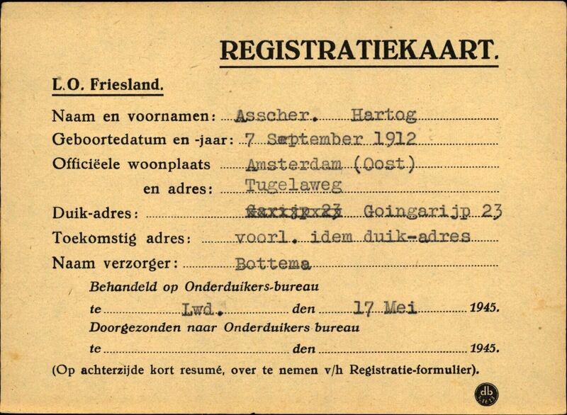 Duikadres: 23, Goingarijp - Oorspronkelijk adres: Tugelaweg, Amsterdam-Oost - Reden onderduik: jodenvervolging - Overige opmerkingen: Achterkant bijzonderheden: werkzaam geweest als land-en tuinbouwer, - ondergedoken wegens Jodenvervolging, - valsch PB; geen stkrt.