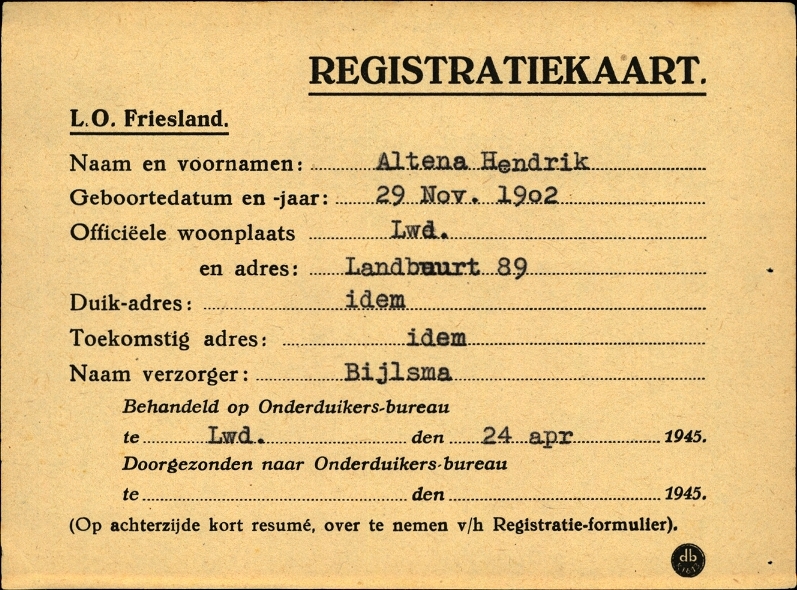 Duikadres: Landbuurt 89, Leeuwarden - Oorspronkelijk adres: Landbuurt 89, Leeuwarden - Reden onderduik: arbeidsinzet - Overige opmerkingen: Achterkant beroep: huwelijksmakelaar