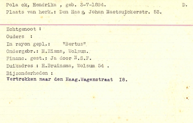 Duikadres: 54, Wolsum - Oorspronkelijk adres: Joan Maetsuyckerstraat 53, `s Gravenhage - Overige opmerkingen: Bijzonderheden: vertrokken naar `s Gravenhage, Wagenstraat 18 -