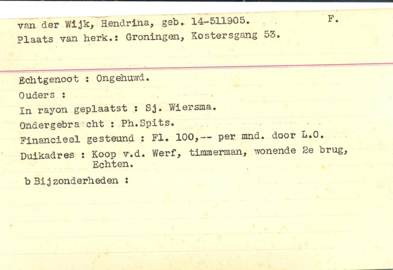Duikadres: 2e brug, Echten - Oorspronkelijk adres: Kostersgang 53, Groningen - Overige opmerkingen: Bijzonderheden: Geboortedatum onduidelijk, staat als 14-511905. Waarschijnlijk 14-5-1905. - ongehuwd - - Financieel gesteund Fl.100,- per mnd. door L.O.