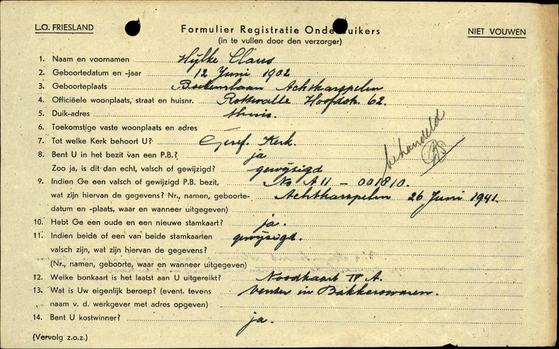 Duikadres: Hoofdstraat 62, Rottevalle - Oorspronkelijk adres: Hoofdstraat 62, Rottevalle - Reden onderduik: anderszins - Overige opmerkingen: Bijzondere opmerkingen: Laatste bonkaart: Noodkaart IV A. PB en stamkaart alleen maar gewijzigd en alleen nu en dan op gevaarlijke momenten ondergedoken.