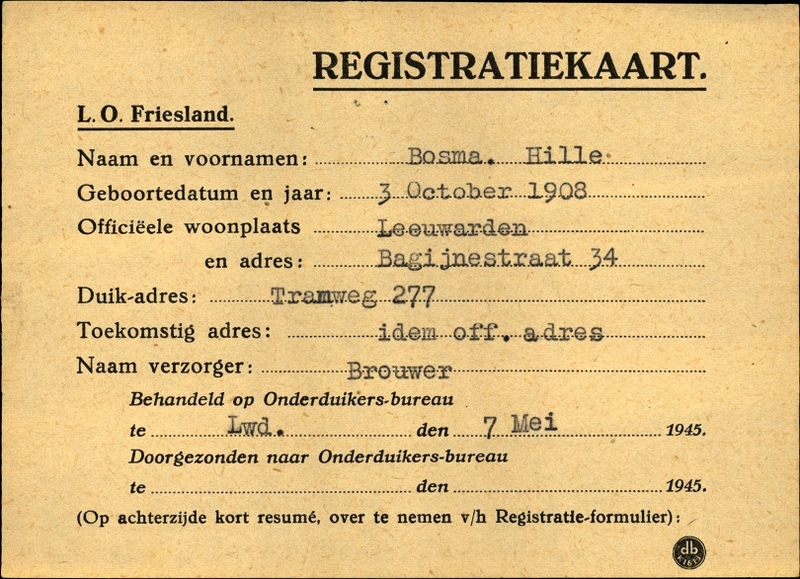 Duikadres: Tramweg 277, - Oorspronkelijk adres: Bagijnestraat 34, Leeuwarden - Reden onderduik: arbeidsinzet - Overige opmerkingen: Achterkant beroep: grossier in haring