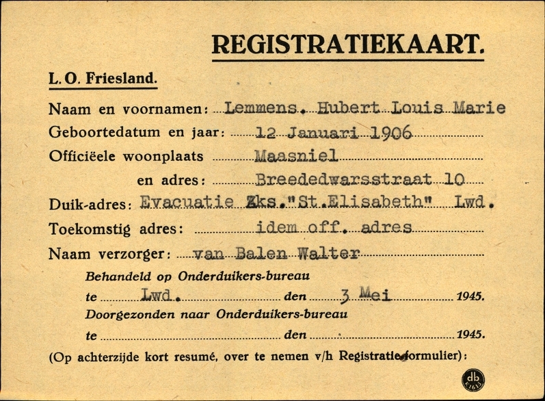 Onderduikinschrijving van Hubert Louis Marie Lemmens
