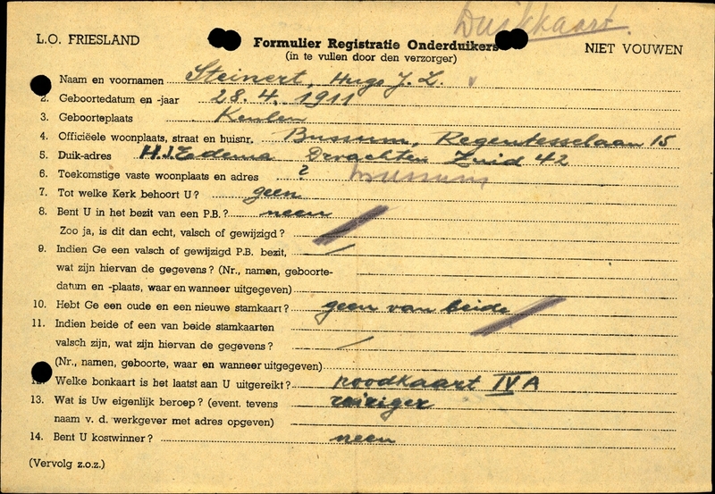 Onderduikinschrijving van Hugo J.Z. Steinert